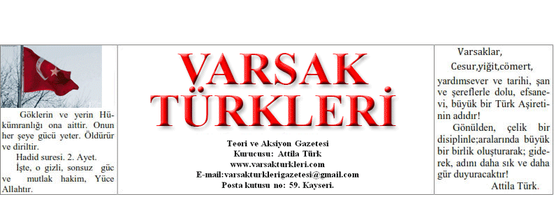 VARSAK TÜRKLERİ gazetesi, hadiseleri daima büyük Türk tarih şuuru ile yorumlayacak ve Türk Milletinin varlığına, birliğine ve ülke bütünlüğüne karşı yapılan eylem, tavır ve oluşumlar karşısında,alınması gerekli, ANTİ OPORTÜNİST politik,sosyal ve kültürel tedbirlerle, yapılması zorunlu olan organizasyon, iş ve eylem hususlarında kendi düşünce ve görüşlerini sunarak, bunları Türk kamu oyu ile paylaşacaktır... Ümit ederiz ki, birileri çıkarda, bunlar üzerinde düşünür, bir pay alır ve bunları uygular…